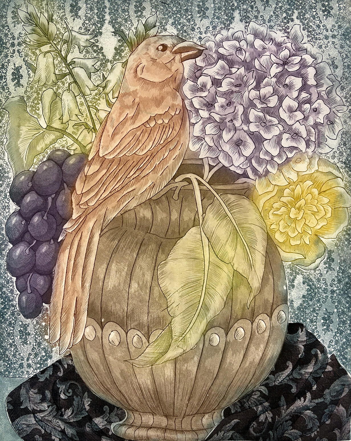 Finch and Flowers, 12″ x 15″ 2025, Aquatint etching